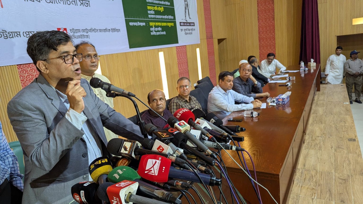সিএমইউজে সেক্রেটারি সালেহ নোমান ও চট্টগ্রাম প্রেস ক্লাবের অন্তর্র্বতী কমিটির সদস্য গোলাম মাওলা মুরাদের সঞ্চালনায় এতে আরও বক্তব্য রাখেন চট্টগ্রাম মেট্রোপলিটন সাংবাদিক ইউনিয়নের সভাপতি মোহাম্মদ শাহনওয়াজ, কমনওয়েলথ জার্নালিস্টস এসোসিয়েশনের বাংলাদেশ চ্যাপ্টারের সেক্রেটারি ও পিপলস ভিউ সম্পাদক ওসমান গণি মনসুর, প্রিমিয়ার বিশ্ববিদ্যালয়ের উপাচার্য অধ্যাপক ড. নসরুল কদির, বাংলাদেশ সম্মিলিত পেশাজীবী পরিষদ চট্টগ্রামের সদস্য সচিব ডা. খুরশীদ জামিল, এসোসিয়েশন অব ইঞ্জিনিয়ার্স বাংলাদেশ চট্টগ্রাম বিভাগীয় সভাপতি প্রকৌশলী জানে আলম সেলিম, চট্টগ্রাম জেলা আইনজীবী সমিতির সভাপতি আব্দুস সাত্তার, চট্টগ্রাম বিশ্বিবদ্যালয়ের গণ যোগাযোগ ও সাংবাদিকতা বিভাগের সহযোগী অধ্যাপক শহীদুল হক, বাসসের বিশেষ প্রতিনিধি মিয়া মোহাম্মদ আরিফ, বাংলাদেশ গণতান্ত্রিক ছাত্র সংসদের যুগ্ম সদস্য সচিব রিজাউর রহমান, জাতীয় নাগরিক কমিটির সদস্য নীলা আফরোজ, বৈষম্য বিরোধী ছাত্র আন্দোলনের রিজোয়ান সিদ্দিকী, চৌধুরী সিয়াম এলাহী প্রমুখ।