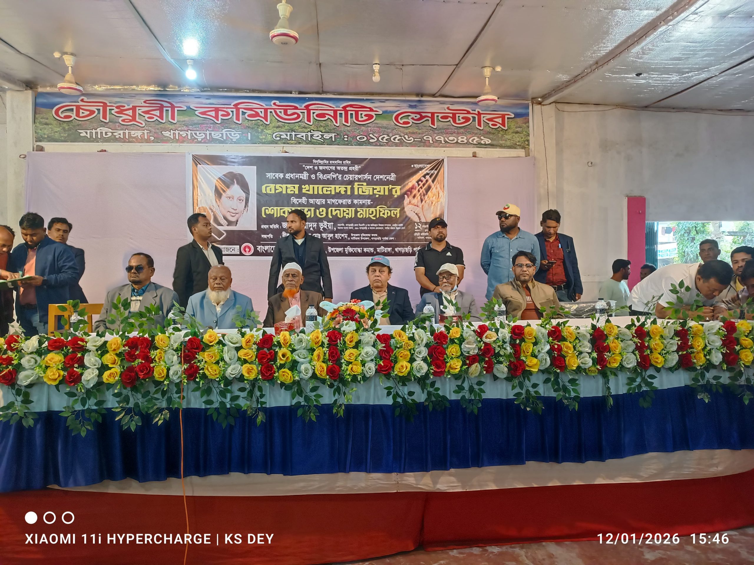 সোমবার (১২ জানুয়ারি) বিকালের দিকে মাটিরাঙ্গার চৌধুরী কমিউনিটি সেন্টারে মাটিরাঙ্গা উপজেলা মুক্তিযোদ্ধা সংসদ কমান্ড আয়োজিত বেগম খালেদা জিয়ার রুহের মাগফেরাত কামনায় শোকসভা ও দোয়া মাহফিলে প্রধান অতিথির বক্তব্যে তিনি এ কথা বলেন।