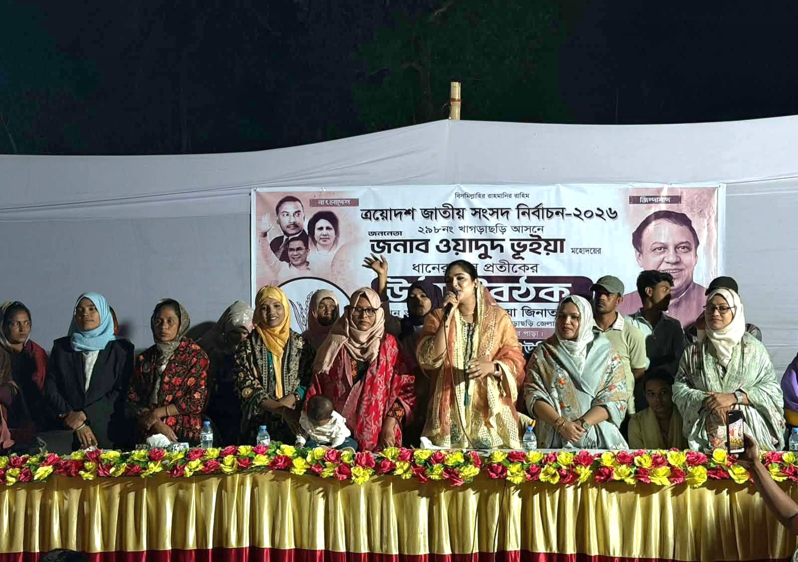 খাগড়াছড়ি সংসদীয় আসনে বিএনপি মনোনীত প্রার্থী ও খাগড়াছড়ি জেলা বিএনপি'র সভাপতি ওয়াদুদ ভূইয়ার জন্য ধানের শীষে ভোট চেয়ে খাগড়াছড়ির মাটিরাঙ্গায় একাধিক নির্বাচনী সভা সমাবেশ করেছেন ওয়াদুদ ভুইয়ার সহধর্মিণী ও খাগড়াছড়ি জেলা বিএনপির প্রধান উপদেষ্টা জাকিয়া জিনাত বিথী।