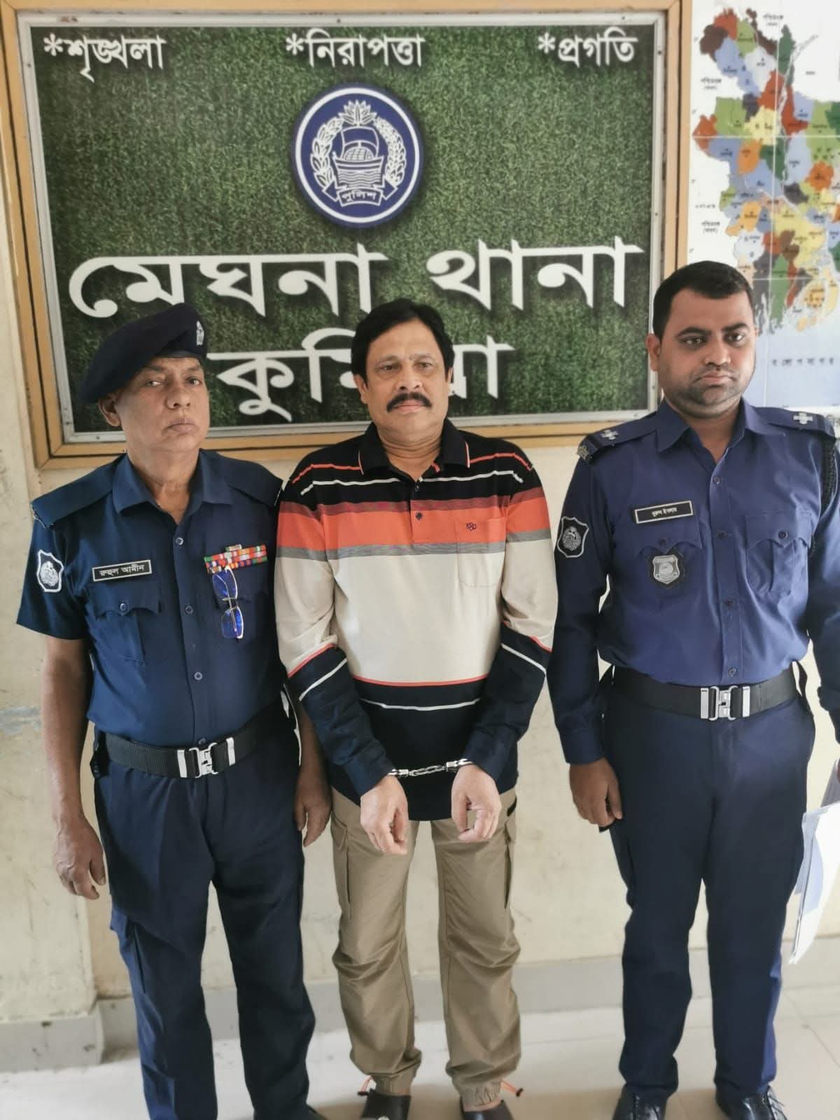 এ বিষয়ে মেঘনা থানা ভারপ্রাপ্ত কর্মকর্তা (ওসি) শহীদুল ইসলাম বলেন, “৪৫ লাখ টাকা অর্থদণ্ডে দণ্ডিত ও এক বছরের সাজাপ্রাপ্ত হওয়ার পাশাপাশি তাঁর বিরুদ্ধে চাঁদাবাজির মামলায় পরোয়ানা থাকায় তাকে গ্রেপ্তার করা হয়েছে। রবিবার সকাল সাড়ে ১০টার দিকে তাকে আদালতে প্রেরণ করা হয়েছে। এর আগেরদিন শনিবার সন্ধ্যা সাড়ে ৭টায় আমাদের টিম বিশেষ অভিযান চালিয়ে তাকে গ্রেফতার করেছিল।”